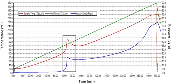 An exotherm is detected near the intended reaction temperature (indicated by the rectangle) and would need serious consideration. The reaction runs away to a pressure of around 20 bar, which could violently rupture the reactor full of toxic chemicals.